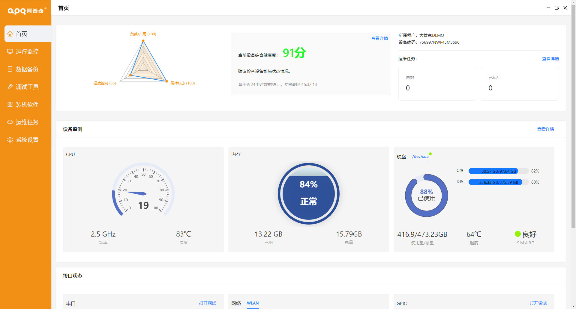 支持IPC運(yùn)行狀態(tài)上報(bào)、監(jiān)測(cè)運(yùn)行異常事件并上報(bào),支持硬件接口管控、軟件管控及軟件看門(mén)狗、網(wǎng)絡(luò)端口管控,支持通過(guò)大管家進(jìn)行遠(yuǎn)程控制、支持運(yùn)維任務(wù)接收并執(zhí)行等功能。