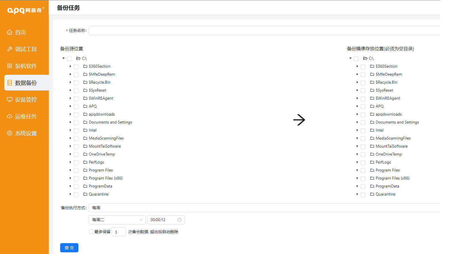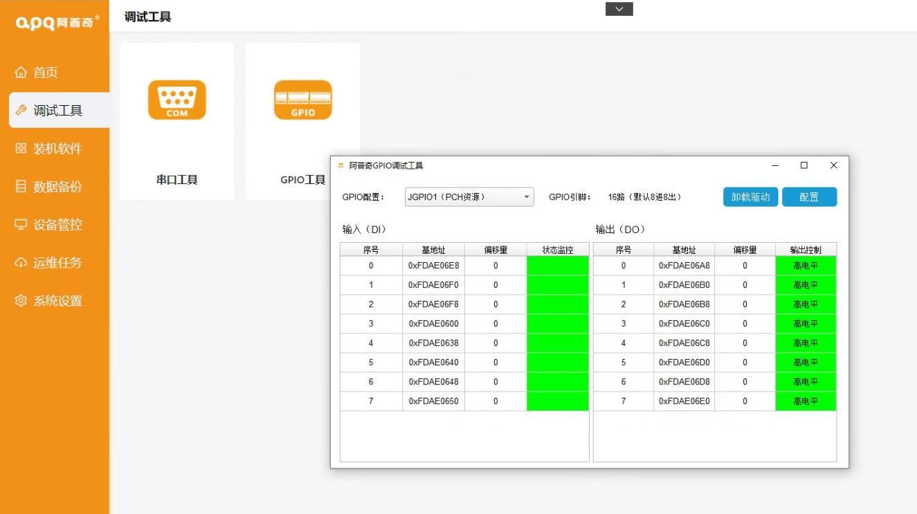支持對(duì)IPC運(yùn)行狀態(tài)進(jìn)行監(jiān)測(cè)記錄,支持對(duì)文件夾進(jìn)行數(shù)據(jù)備份,支持對(duì)阿普奇出廠的設(shè)備進(jìn)行串口調(diào)試或GPIO調(diào)試。