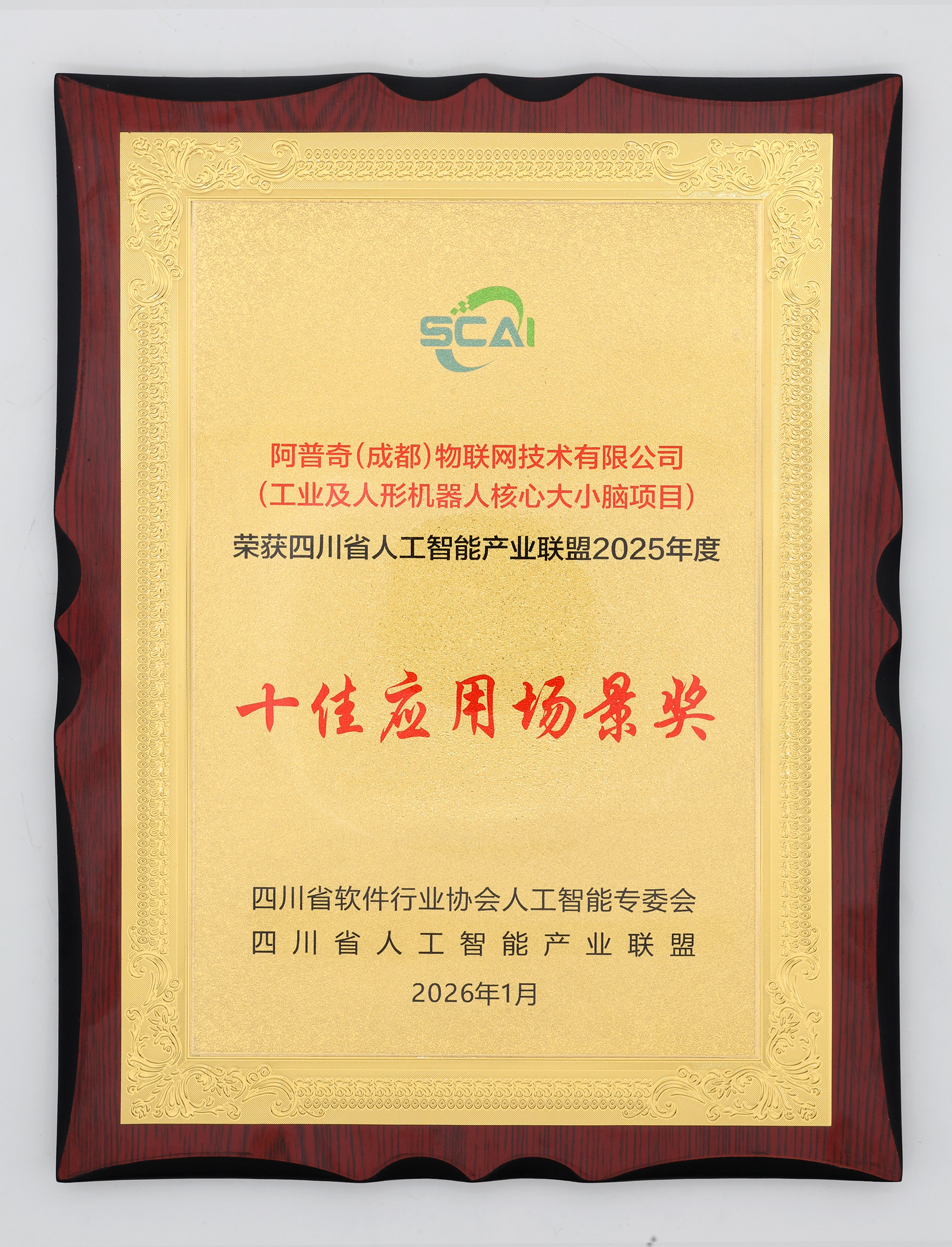 在四川省人工智能產業聯盟2025年會上,阿普奇“工業及人形機器人核心大小腦項目”獲評“十佳應用場景獎”。